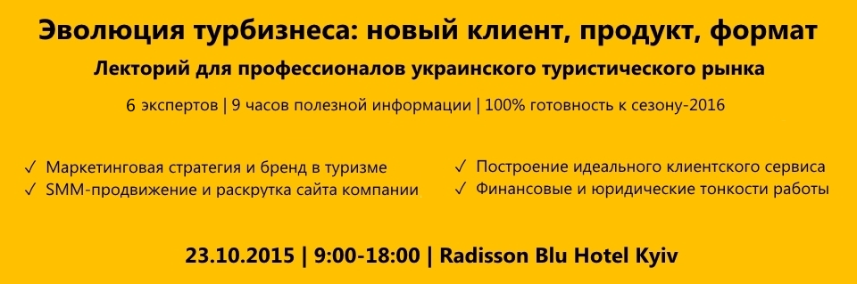 На мероприятии вас ждет насыщенная программа: шесть лекций от экспертов в сфере маркетинга, клиентского сервиса, юридических и финансовых вопросов, SMM и продвижения сайта. Все – с прицелом на туристический рынок Украины и современные «правила игры» для туркомпаний: